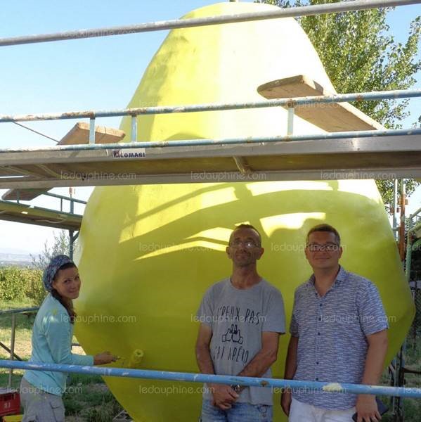 Trois étudiants de la Maison Familiale Rurale d’Anneyron (MFR) en section BTS ont participé au nettoyage de la sculpturale poire dans le cadre de leur programme pédagogique.