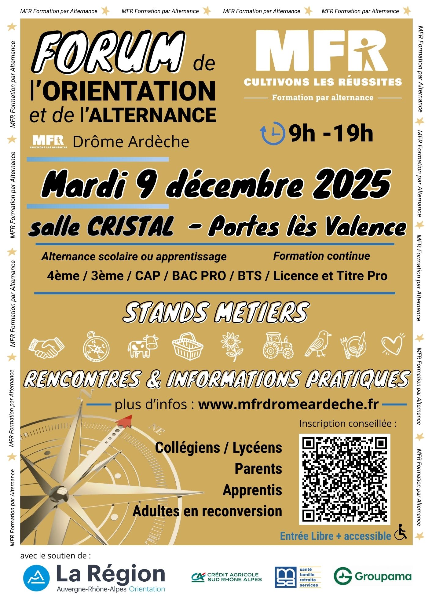 FORUM 2025 Inscription conseillée Afin de vous réserver le meilleur accueil, nous vous proposons de vous inscrire ICI “Choisir son orientation, c’est choisir son avenir." Avec ce Forum de l’Orientation et de l’Alternance, les Maisons Familiales Rurales (MFR) de Drôme Ardèche veulent offrir aux jeunes, aux familles et aux partenaires un temps fort d’échanges, de découvertes et de rencontres. Plus qu’un salon, ce forum est une passerelle vers le concret : découvrir des métiers, parler avec des jeunes déjà en formation, rencontrer des entreprises, et pourquoi pas franchir le pas d’une immersion en MFR dès janvier prochain.”